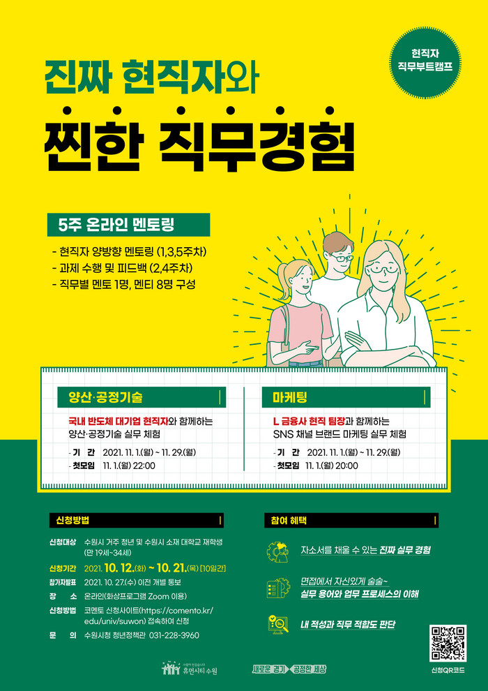 수원 거주 청년들과 수원시 소재 대학교 재학생(만 19세~34세)이 대상이다. 멘토링은 ‘양산·공정기술’, ‘마케팅’ 등 2개 직무로 나눠서 진행되며 직무별로 현직자 1명이 멘토로 배정된다.