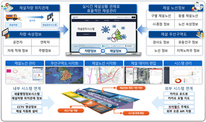 담당 공무원들은 업무 PC로 제설 우선 구역과 노선도, 제설 자재 현황, 제설 삽날 장착차·살포기·굴착기 위치, 교통상황 등을 통합적으로 파악해 실시간 제설상황을 관제할 수 있게 된다.