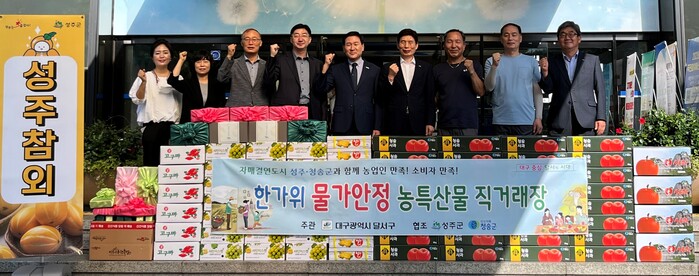 [로컬세계=박세환 기자] 대구 달서구(구청장 이태훈)는 지난 7일 구청 광장에서 이번 추석명절 물가안정을 도모하고 농업인들의 판로를 지원하기 위해 자매결연도시 성주·청송과 함께 하는 농산물 직거래행사를 개최했다.