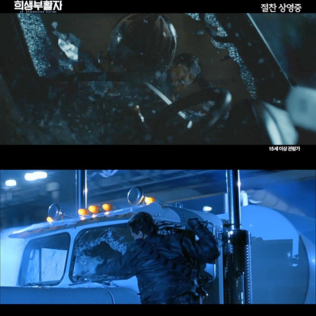 영화 '희생부활자'의 현봉식과 영화 '터미네이터 2'의 아놀드슈왈 제네거가 트럭의 유리창을 깨는 장면이 화제가 되고 있다.