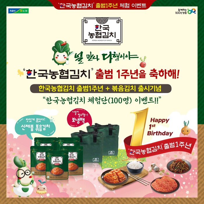 농협경제지주는 오는 23일까지 한국농협김치 공식 인스타그램에서 한국농협김치 출범 1주년 맞이 ‘함께하는 1주년 축하 댓글 이벤트’를 열고 SNS 체험단 100명을 모집한다.