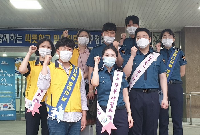 | ▲수성구청소년상담복지센터와 수성경찰서가 청소년 코로나19 심리건강 지키기 캠페인 후 기념촬영을 하고 있다.(수성구 제공) |