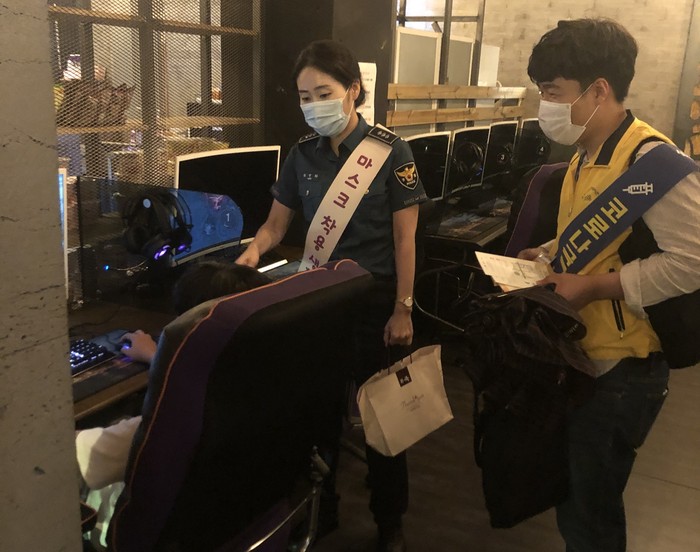 | ▲수성구청소년상담복지센터와 수성경찰서가 합동으로 PC방에서 청소년 코로나19 심리건강 지키기 캠페인을 실시하고 있다. |