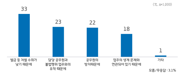 도민들은 하천·계곡 불법행위가 방치돼 온 원인으로 ▲벌금 등 낮은 처벌 수위(33%)를 가장 높게 지적했다. 그 밖에 ▲담당 공무원과 불법행위 업주와의 유착(23%) ▲복잡한 행정처분 절차, 업주의 항의 등에 따른 공무원의 방치(22%) 등도 꼽았다.