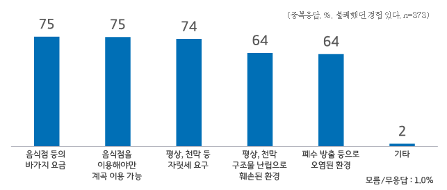 도민 58%가 최근 5년간 하천·계곡을 찾은 것으로 조사됐는데, 이들 중 과반 이상인 65%가 ▲바가지 요금(75%) ▲음식점을 이용해야만 계곡 이용 가능(75%) ▲자릿세 요구(74%) 등과 같은 좋지 못한 기억을 가진 것으로 나타났다.