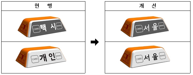 이에 따라 개인택시의 경우 택시표시등 앞면 ‘개인’, 뒷면 ‘택시’라고 표기돼 있으며 법인택시는 앞면 ‘택시’, 뒷면 ‘TAXI’로 표기돼 있으나 앞으로는 개인·법인택시 모두 택시표시등 앞면은 ‘서울’, 뒷면은 ‘택시(또는 TAXI)’로 변경된다.