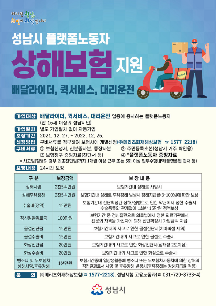 [로컬세계 김병민 기자]경기 성남시는 배달라이더, 퀵서비스, 대리운전 등 3개 직종 플랫폼노동자들의 사고에 대비해 단체 상해보험에 가입했다고 28일 밝혔다.