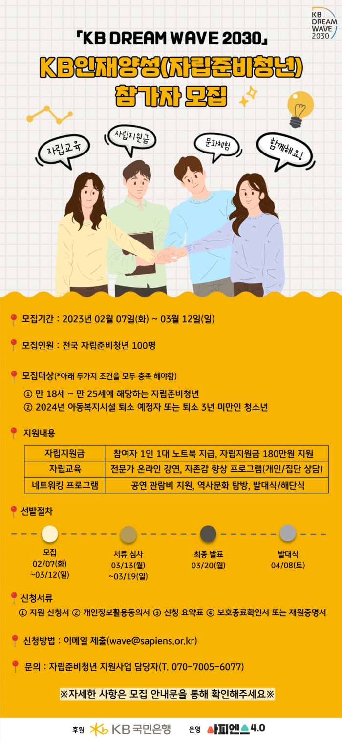 KB국민은행은 자립준비청년 100명을 선발해 자립 지원금과 노트북을 제공한다. 더불어 사회로 첫 걸음을 내디딜 때 필요한 부동산, 경제, 법률, 진로, 자립 이야기 총 5개 분야의 전문가 교육도 병행해 자립준비청년이 사회에 안전하게 자립 할 수 있도록 뒷받침하고 있다.