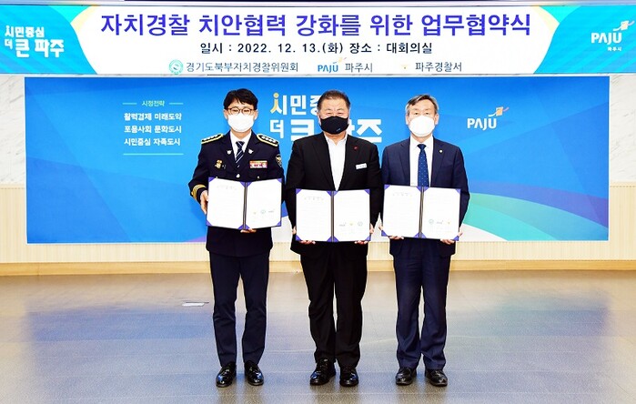 [로컬세계 = 이영원 기자]경기 파주시(시장 김경일)는 지난 13일 북부자치경찰위원회, 파주경찰서와 위기아동 보호센터 설치 및 행복마을 관리소-자치경찰 상호협업 체계 구축을 위한 업무협약을 체결했다고 14일 밝혔다.