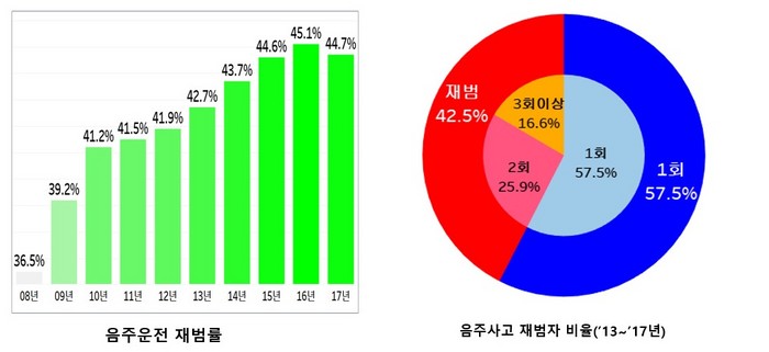 경찰청 관계자는 “음주운전은 선량한 타인의 생명과 안전에 심각한 피해를 입힐 수 있는 매우 중대한 범죄지만 최근 5년 간 전국 음주운전 사고 중 재범자 사고가 43%를 차지하는 등 재범률이 매우 높다”며 “사회 전반적으로 음주운전에 대한 관대한 인식과 문화가 자리 잡고 있어 이에 대한 형사처분을 강화하는 등 음주운전 근절대책이 시급하다”고 지적했다.