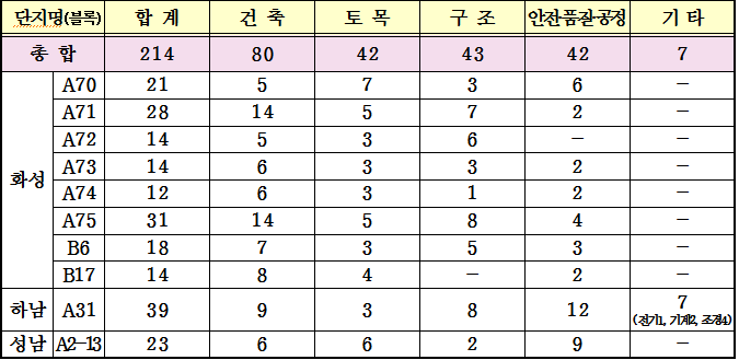 도는 지난 8월 25일부터 9월 1일까지 6일 동안 화성시, 성남시, 하남시와 함께 ㈜부영주택이 도내에 건설 중인 10개 아파트 단지에 대한 특별점검을 시 전문가, 담당 공무원 등 연인원 74명이 참가해 실시했다.