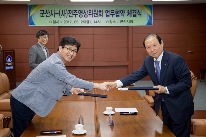 ▲지난 5월 26일 문동신 시장(오른쪽)이 (사)전주영상위원회와 상호 업무협약을 체결하고 기념촬영을 하고 있다.(군산시 제공) |