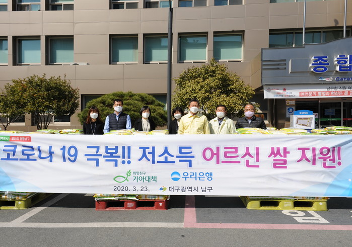 [로컬세계 박세환 기자]대구 남구은 지난 23일 우리은행 후원 희망친구 기아대책에서 코로나19 확산으로 인해 어려움을 겪고 있는 남구 관내 저소득 어르신들을 위해 쌀(10kg) 1000포를 전달했다고 24일 밝혔다.