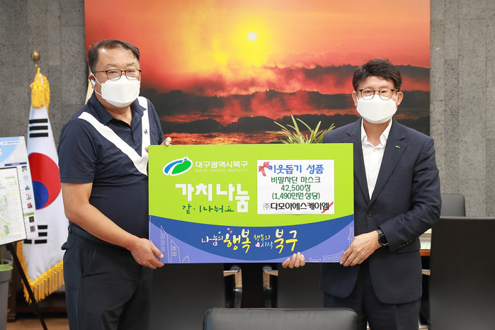 [로컬세계 박세환 기자]대구 북구는 지난 25일 ㈜다모아에스케이엠(대표 김종민)에서 구청을 방문해 코로나19로 어려움을 겪고 있는 이웃들을 위해 사용해 달라며 비말차단마스크 4만2500장을 기탁했다고 26일 밝혔다.