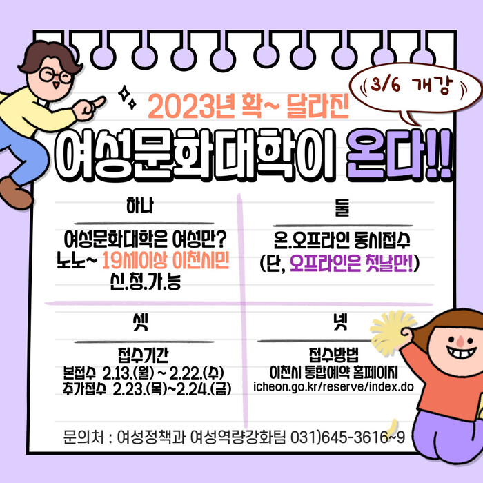 특히 올해는 여성 위주로 신청 가능했던 기존의 제도를 바꾸어 만19세 이상 이천시에 거주하고 있는 사람이라면 누구나 수강 신청이 가능하다.