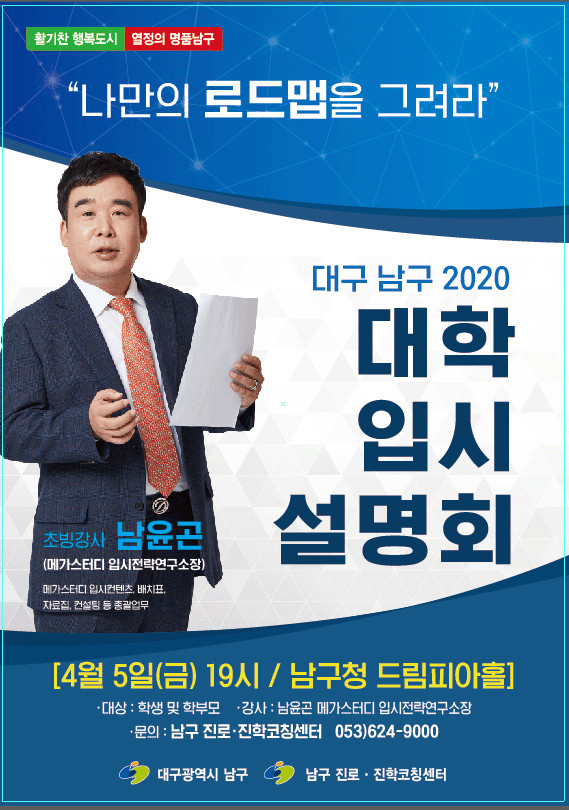 [로컬세계 박세환 기자]대구시 남구청은 오는 5일 오후 7시 남구청 드림피아홀에서 ‘2020 대학입시 설명회’를 연다고 3일 밝혔다.