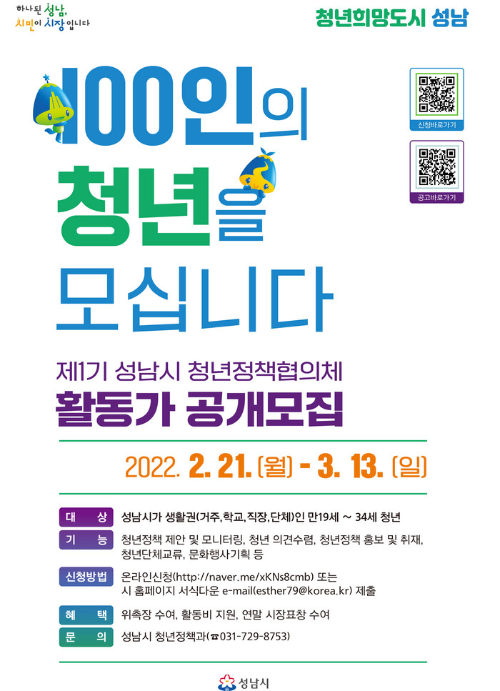 [로컬세계 김병민 기자]경기 성남시는 오는 3월 13일까지 ‘제1기 청년정책협의체 활동가’ 100명을 공개 모집한다.