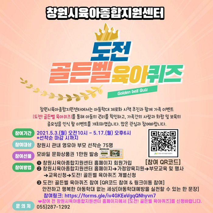 이번 행사는 육아상식 및 아동학대 예방과 관련한 관한 내용으로 선착순 참여자 75명에게 문화상품권 1만원이 증정되며, 창원시육아지원센터 홈페이지에 회원가입 후 ‘도전! 골든벨 육아퀴즈’에 개별 신청해 퀴즈에 참여하면 된다.
