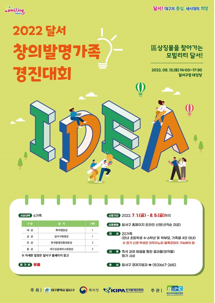 2022 달서 창의발명가족 경진대회는 달서구와 특허청이 공동 주최하고 대구지식재산센터가 주관하는 행사이다.