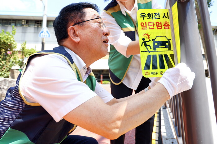 ▲ 문헌일 구청장이 교통안전수칙 홍보물을 부착하고 있다. |