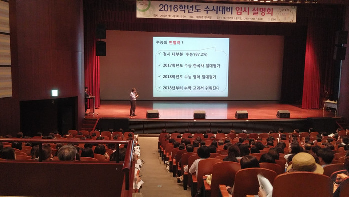 이날 한태명 한국대학교육협의회 소속 강사(오산고 교사)가 주요 대학별 2017학년도 수시전형 방안을 설명한다. 이어 장창곡 한국대학교육협의회 소속 대표 강사(계산고 교사)가 나와 학생부 종합평가 방법, 학생선발 방식, 중요 평가요소, 준비전략을 알려준다.