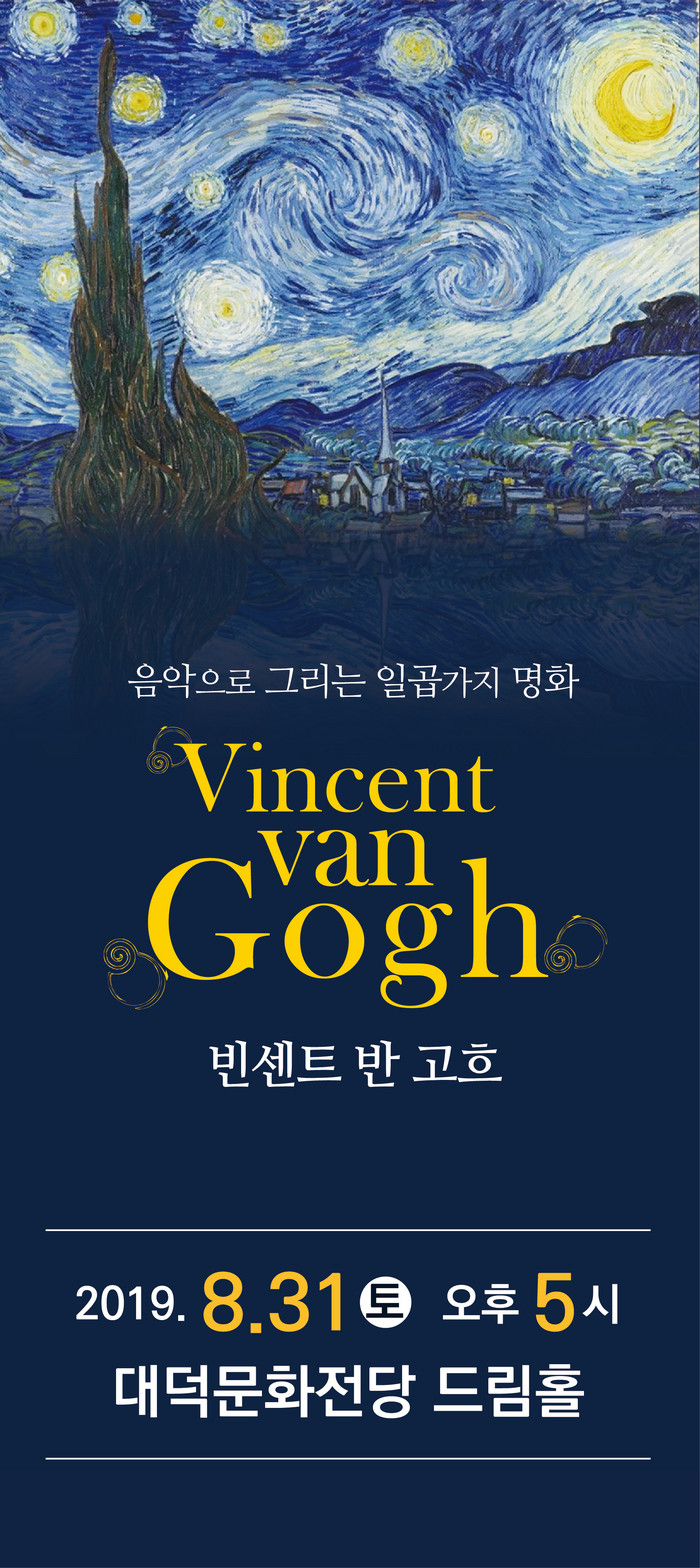 동서양을 막론하고 전세계적으로 사랑받고 있는 화가 빈센트 반 고흐 작품 중 ‘별이 빛나는 밤(1889)’, ‘아를르의 포룸 광장의 까페테라스 (1888)’, ‘수확하는 사람(1889)’, ‘귀에 붕대를 감은 자화상(1889)’ 등 7가지 작품을 선정해 작품에 얽힌 고흐의 예술적 삶과 사랑 이야기 를 미술과 음악의 융합으로 만들어낸다.