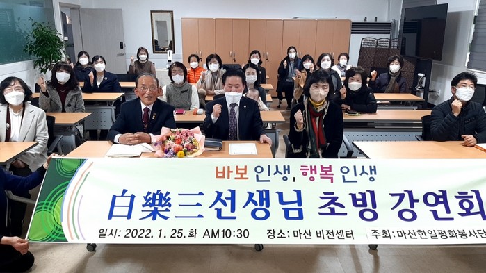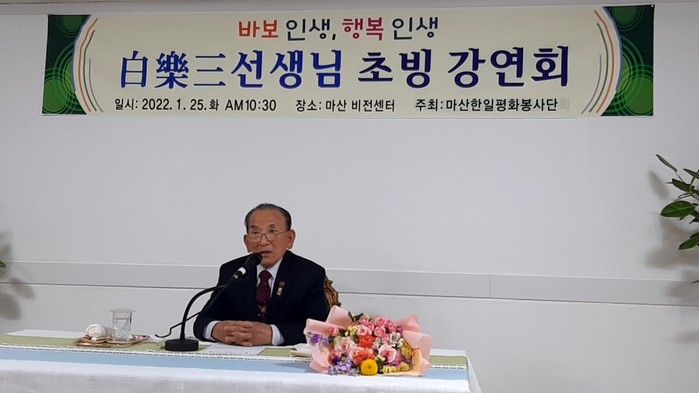 [로컬세계 정종호 기자]경남 창원시 마산 가정교회 비전센터는 지난 25일 오전에 마산 한일평화봉사단&한일문화친선교류회(회장 사토유카리) 공동주최로 백낙삼(92세) 신신예식장 대표 초청 강연회를 개최했다.