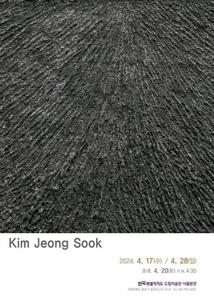 이 전시회는 전북 도립미술관의 서울분관 개관을 기념하여 기획된 오프닝 전으로, 김정숙 교수는 갯벌, 숯, 한지 등 독특한 소재를 사용한 미니멀리즘 풍의 신작 60여 점을 대작 위주로 선보인다.