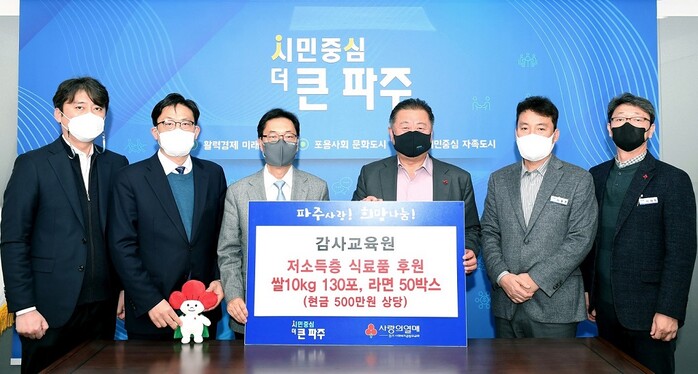 김경일 파주시장은 “고물가로 힘든 시기에 지역의 어려운 이웃을 위한 정성에 진심으로 감사드린다”며 “전달받은 물품은 관내 저소득 취약계층에 소중히 전달하겠으며 앞으로도 관내 어려운 이웃에 많은 관심을 부탁드린다”고 전했다.
