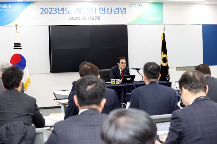 ▲ 이성희 농협중앙회장은 21일 서울 양재동 농협정보시스템 본사에서 '교육지원부문 계열사 현장경영'을 주재하고 있다. 농협 제공 |
