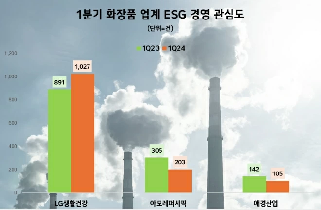 LG생활건강이 올해 1분기 총 1,027건의 ESG 경영 관련 포스팅 수를 나타내며 3사 중 1위를 차지했다.