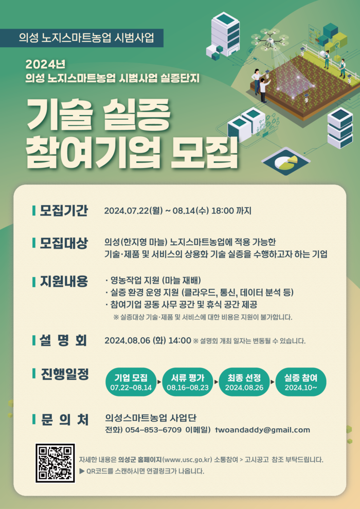 신청 자격은 노지 스마트농업에 적용이 가능한 기술·제품 및 서비스를 보유한 기업이다. 의성 노지 스마트농업 대상 작물인 마늘 생육 관리에 적용할 수 있는 기술이어야 한다.