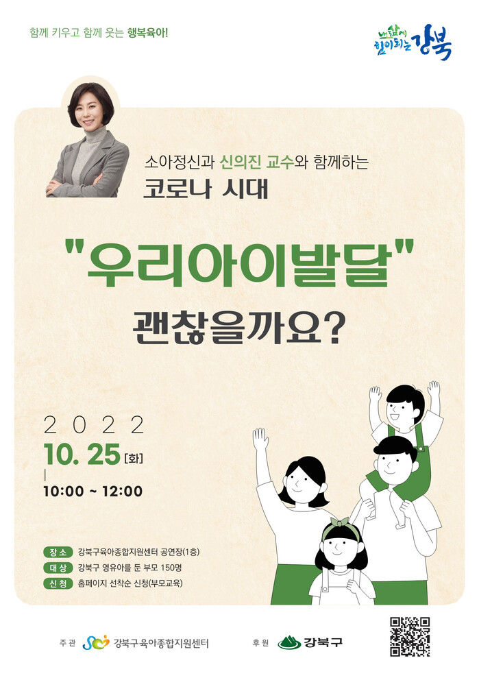 강연은 오는 25일 오전 10시 강북구육아종합지원센터 공연장에서 진행되며 강사는 연세대학교 세브란스 병원 소아정신과 신의진 교수다.