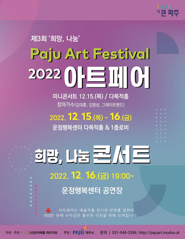 15일부터 16일까지 이틀간 진행되는 ‘아트페어’는 파주예총의 전문예술인들이 미술· 사진·시화작품을 전시·판매하는 행사로 운정행복센터 다목적홀과 1층 로비에서 열리며, 지역가수 김대현, 김명상, 그레이스밴드가 함께하는 미니콘서트도 즐길 수 있다.