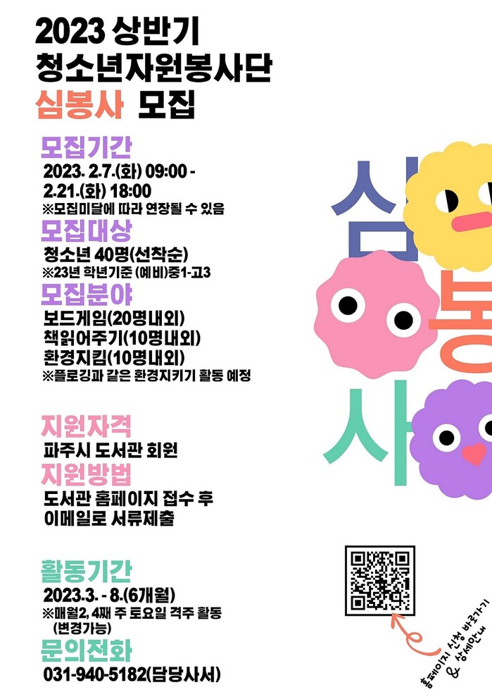 [로컬세계 = 이영원 기자]경기 파주시 교하도서관은 청소년 자원봉사단 ‘심(心)봉사’를 7일부터 선착순으로 모집한다.