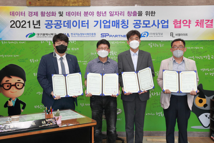 [로컬세계 박세환 기자]대구 북구청은 행정안전부 주관 공공데이터 뉴딜사업의 일환인 ‘2021년 공공데이터 기업매칭 공모사업’에 선정돼 한국지능정보사회진흥원(NIA), 공급기업(주식회사 에스피파트너스, 범일정보, 비엘라이트)과 지난 21일 다자간 업무 협약을 체결했다.