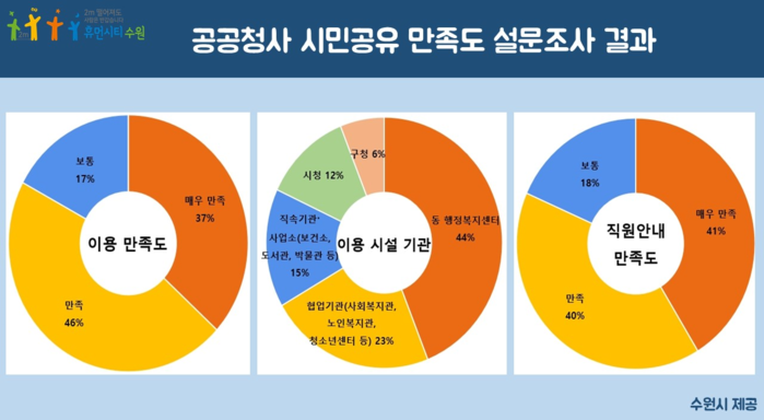 23일 수원시에 따르면 시는 지난달 26일부터 이달 19일까지 수원시청 홈페이지(온라인)와 시·구·동 민원실에서 진행한 ‘공공청사 시민공유 만족도 설문조사’에서 응답자의 83%가 “시민공유 서비스에 전반적으로 만족한다”고 답했다.