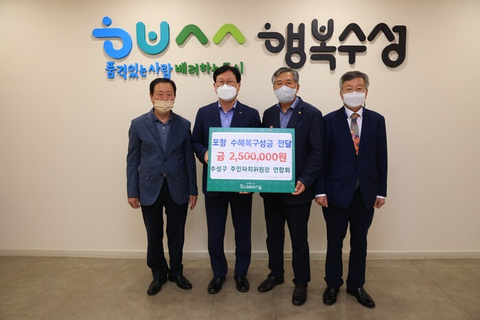 대구 수성구 주민자치위원장연합회(회장 박은용)는 지난 26일 포항지역 수해 복구를 위한 성금 250만원을 수성구청을 통해 전달 후 기념 촬영하고 있다.(사진=수성구 제공)