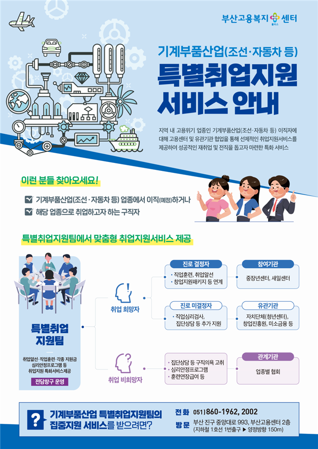 [로컬세계 맹화찬 기자]부산지방고용노동청은 1일부터 조선·자동차 등 기계부품산업 이직(예정)자 및 구직자, 해당 기업 등을 대상으로 '특별취업지원팀'을 설치·운영한다.