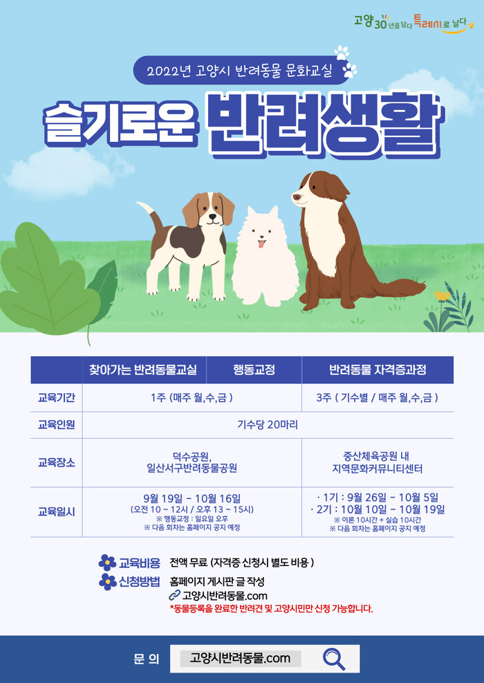 [로컬세계 = 이영원 기자]경기 고양특례시가 성숙한 반려동물 문화 정착을 위해 ‘2022년 고양시 반려동물 문화교실’을 운영한다고 15일 밝혔다.