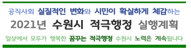 [로컬세계 고용주 기자]경기 수원시가 ‘공직사회의 실질적 변화와 시민의 확실한 체감’을 비전으로 하는 ‘2021 적극행정 실행계획’을 수립해 추진한다고 15일 밝혔다.