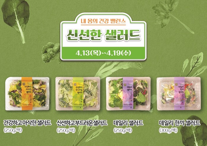 행사 품목은 ▲건강하고 아삭한 샐러드(양배추, 양상추, 비타민, 치커리 등) 120g/250g ▲신선하고 부드러운 샐러드(로메인, 카이피라 등) 120g/250g ▲데일리 샐러드(파프리카 등) 120g/250g ▲데일리 한끼 샐러드(진공팩×3입) 7가지이다.