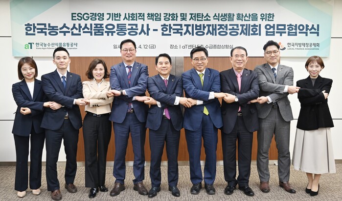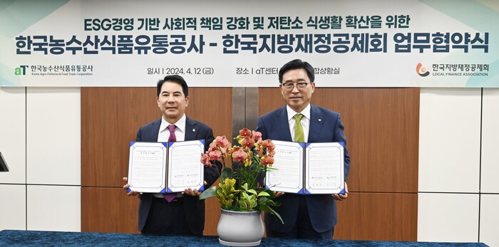 한국농수산식품유통공사(사장 김춘진)와 한국지방재정공제회는 지난 12일 서울 양재동 aT센터에서 ESG 책임경영 강화와 저탄소 식생활 확산을 위한 업무협약을 체결했다고 15일 밝혔다.