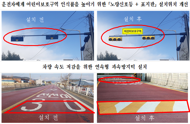 그간 도내 31개 시군에서는 어린이보호구역에 통합표지판을 비롯한 교통안전시설을 개선했고 무인과속단속카메라 1059대, 신호등 2790개소, 어린이보호구역임을 알리는 통합표지 9300개소 등을 설치했다.