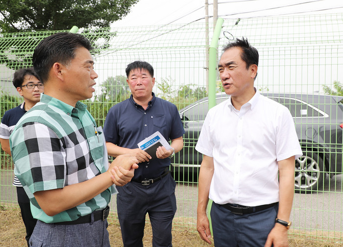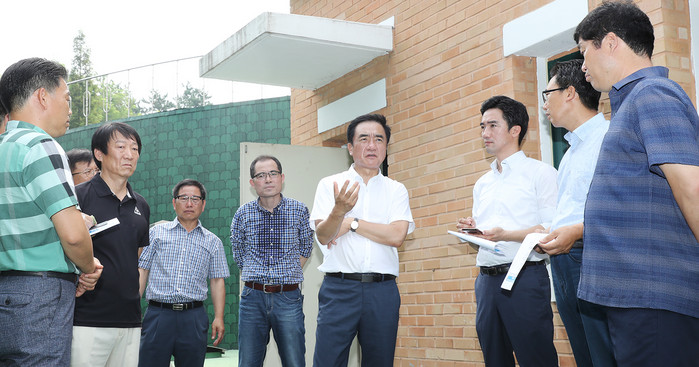 | ▲정장선 시장(가운데)이 28일 폭염대비 청북2배수지와 청북가압장을 방문해 운영상의 문제점 등을 꼼꼼히 살폈다.(평택시 제공) |