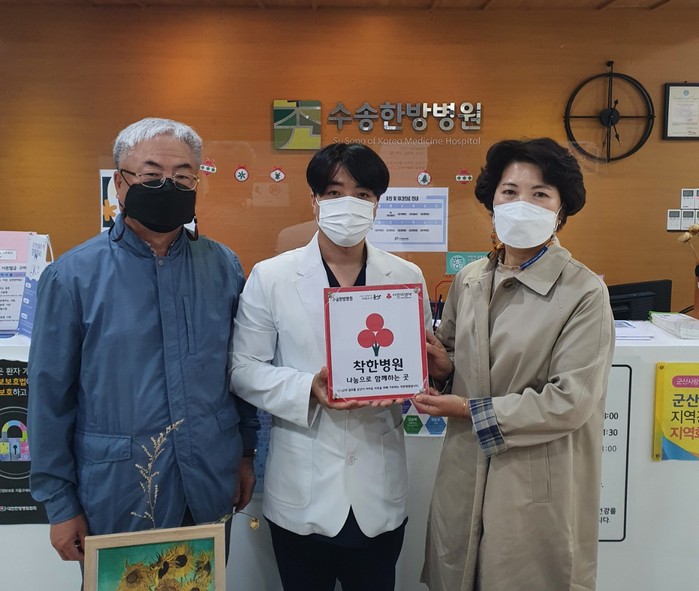 수송한방병원 대표 정민성은 “ 지역의 어려운 이웃들을 도울 수 있는 방법들을 찾고 있었는데 착한가게 가입을 통해서 조금이나마 보탬이 되어 기쁘다”며 “앞으로도 지역사회와 동행해 복지개선에 꾸준히 관심을 갖고 이웃사랑 실천에 동참하도록 노력하겠다“고 소감을 말했다.