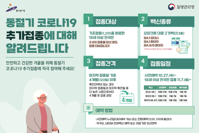 최근에는 고령층의 접종 편의를 위해 관내 노인복지관과 연계해 ‘어르신대상 찾아가는 백신접종’을 실시하고 있으며, 이달 22일에는 단원구 노인복지관에서 오전 10시부터 오후 4시까지 접종이 진행된다.