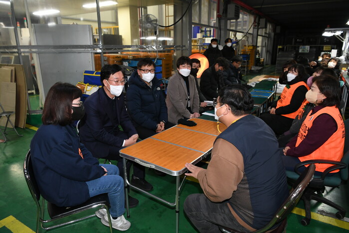 ▲ 이민근 시장이 지난 11일 한국와이퍼 안산공장을 방문해 노조의 이야기를 경청하고 있다. 안산시 제공 |