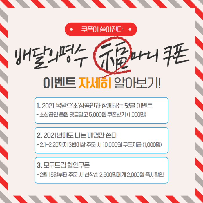 이번 이벤트는 ▲복받으‘소’ 상공인과 함께하는 댓글 이벤트 ▲2021년에도 나는 배명만 쓴다 ▲모두드림 할인쿠폰 이벤트 등 총 3가지 이벤트가 기간별로 진행된다.