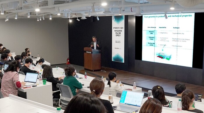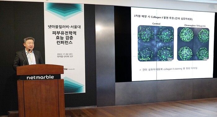 | ▲넷마블힐러비의 피부 유전학적 효능 검증 컨퍼런스에서 서울대 전누리 교수가 연구 결과를 발표하고 있다. |